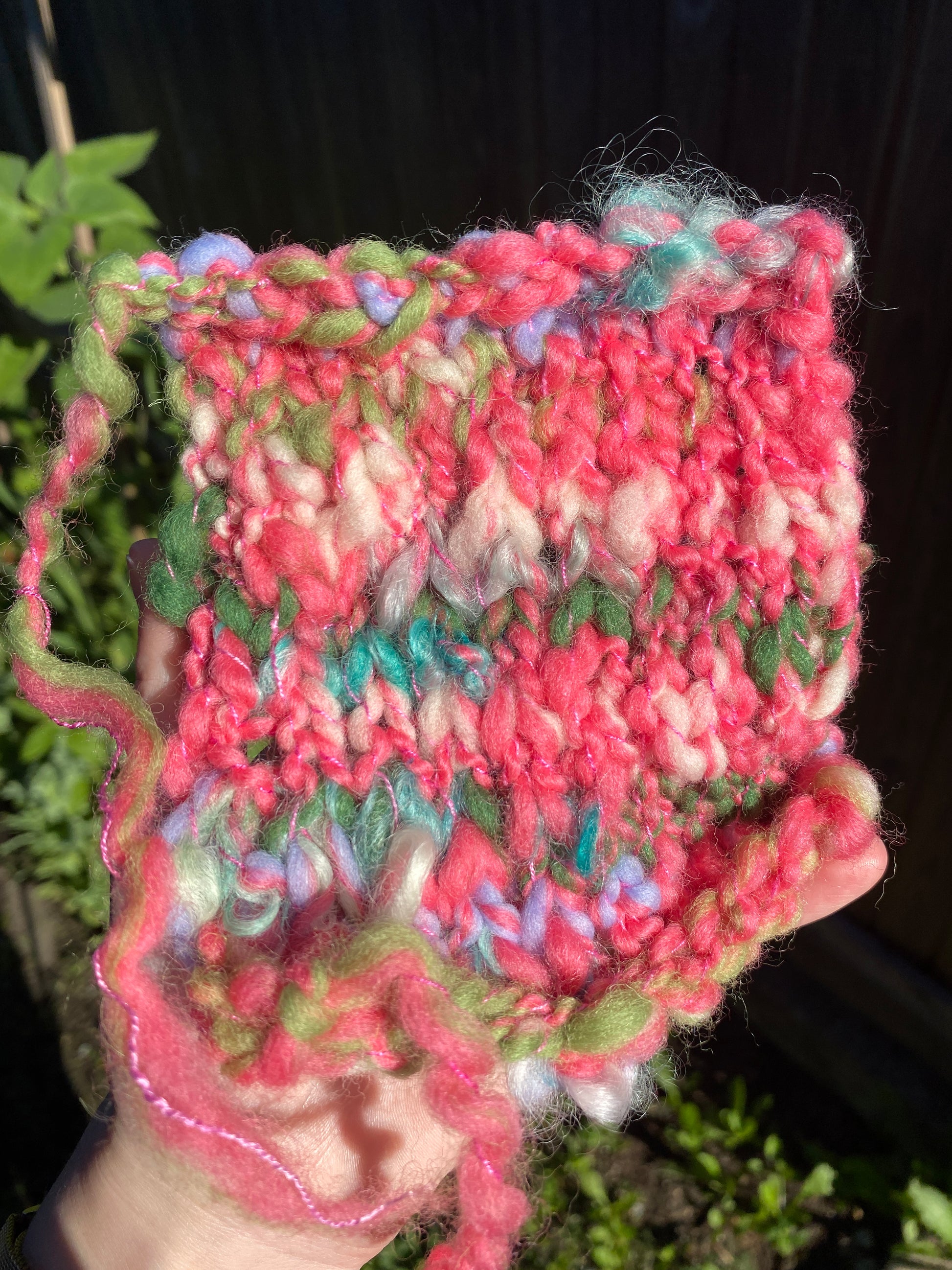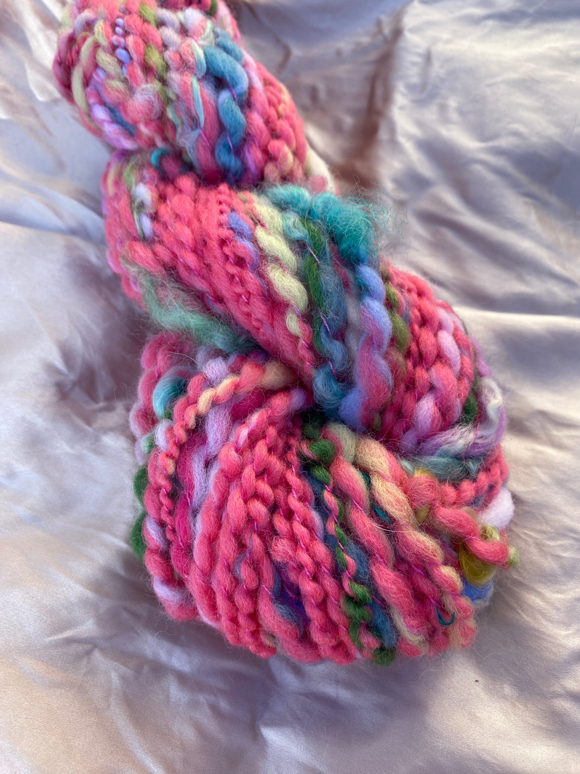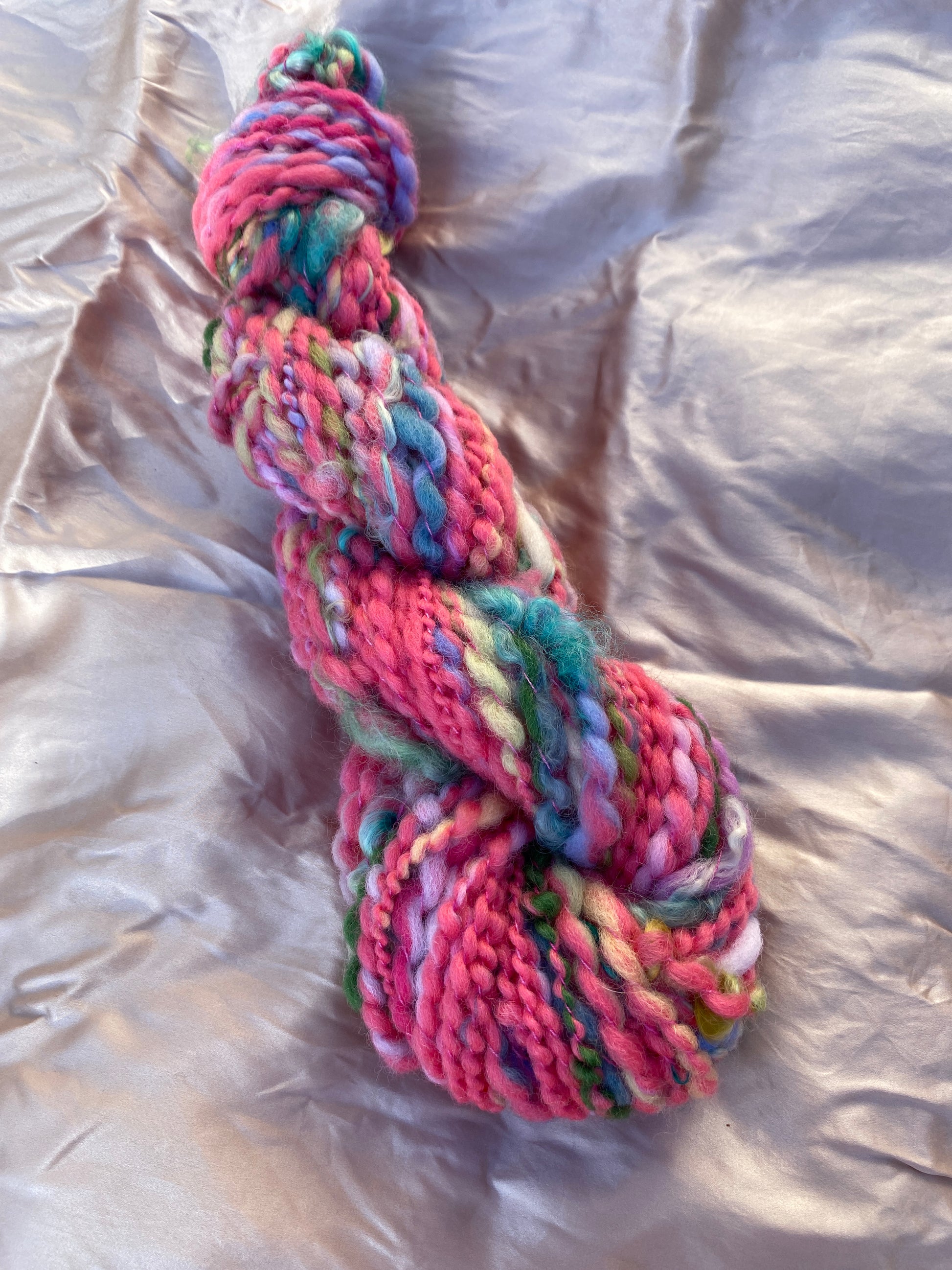 hand spun + hand dyed wool, teeswater locks, silk/viscose